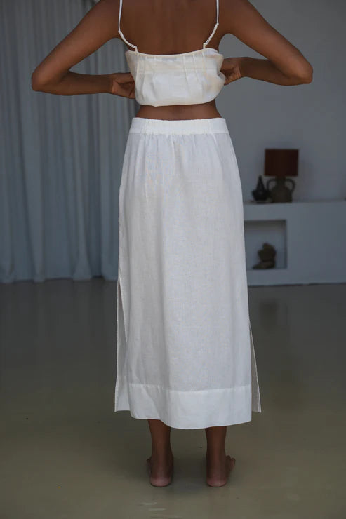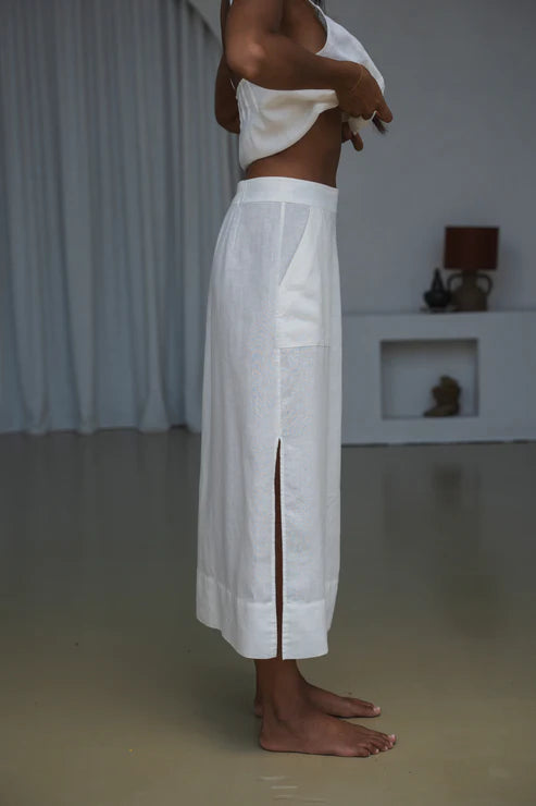 Introducing NADI skirt, crafted with 100% EUROPEAN FLAX® for a breezy, lightweight feel. This straight-cut design features oversized front pockets and side splits for a touch of playfulness. Plus, with an elastic back waist band and French seams, you'll enjoy both comfort and the perfect fit.