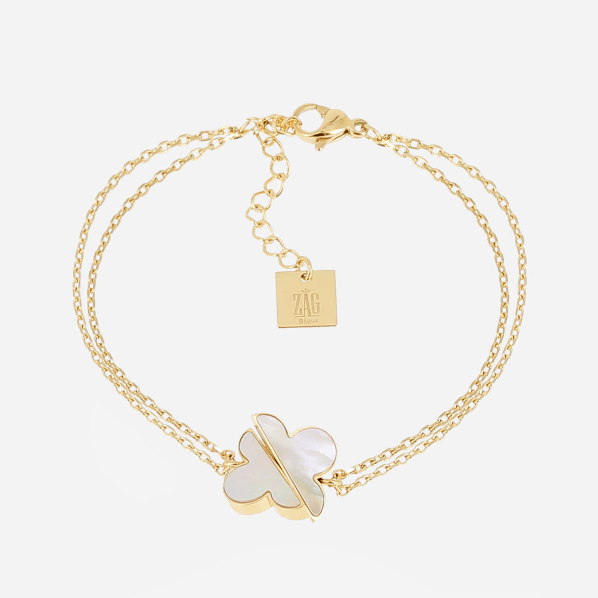 Bracelet in plain or gold steel set with a clover-shaped pendant inlaid with cut mother-of-pearl.
